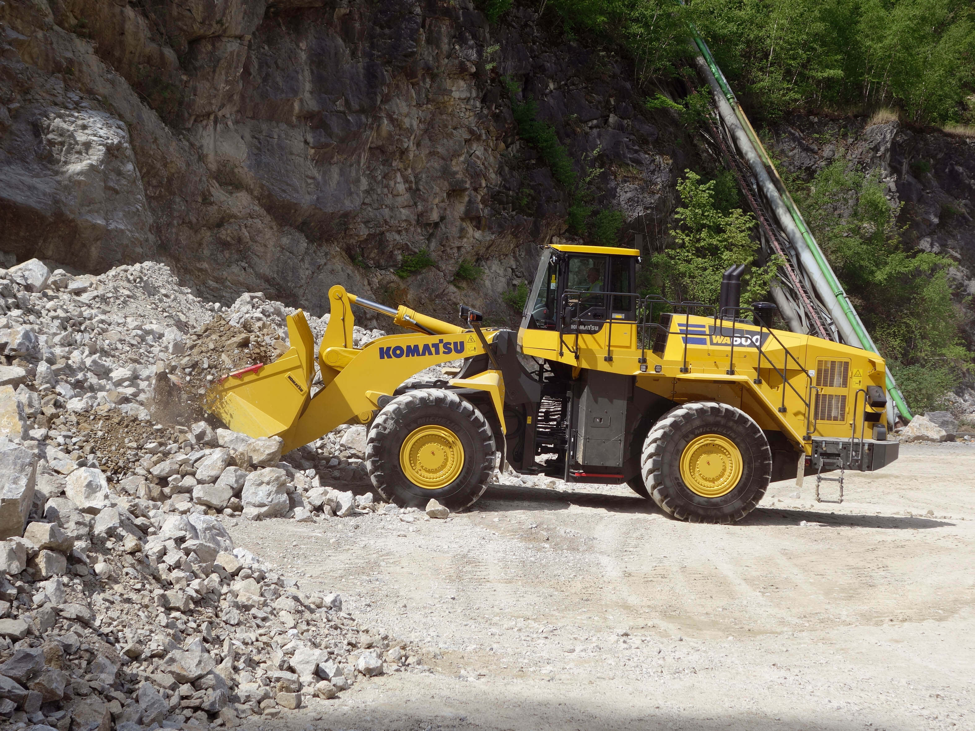 Komatsu’nun sert ve zorlu sahalardaki çözüm ortağı konumundaki yeni nesil WA 500-8E0 lastikli yükleyici, performansı ve verimliliği artırılan özellikleriyle işletmelere değer katıyor. Taş, mermer, kum ocakları ve inşaat sahalarının gereksinimlerini tamamıyla karşılayabilecek şekilde tasarlanan WA 500-8E0, daha düşük yakıt sarfiyatı sunarken yüksek verimlilik için ihtiyaç duyulan gücü sunuyor. 35 tonluk çalışma ağırlığı, 357 HP’lik gücü ve 380 litrelik yakıt depo kapasitesiyle Komatsu WA 500-8E0, mermer sahalarının ihtiyaçlarını kolaylıkla karşılayabiliyor.